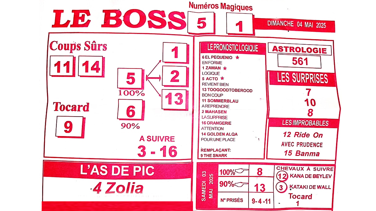 Les Journaux hippiques sélectionnés pour vous (Le Boss + Le Défi). L'avant Quinté de demain Dimanche 04 Mai 2025 - Paris-Longchamp - PRIX DE LA VILLE DE PARIS - R1-C4 - Plat - 16 partants - Départ : 14h15 GMT (Le Boss + Le Défi).